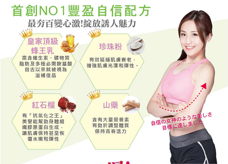 ◆成 份: 泰國葛根、蜂王乳、大豆抽出物(含異黃酮)、鹿茸、王不留行、紅花苜蓿、紅景天、當歸、淮山、植物性膠囊、水、二氧化鈦