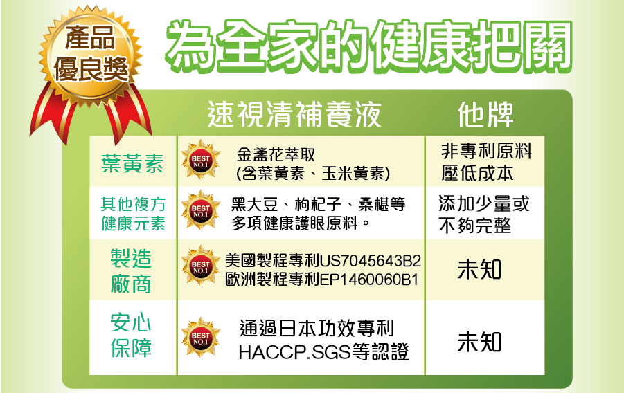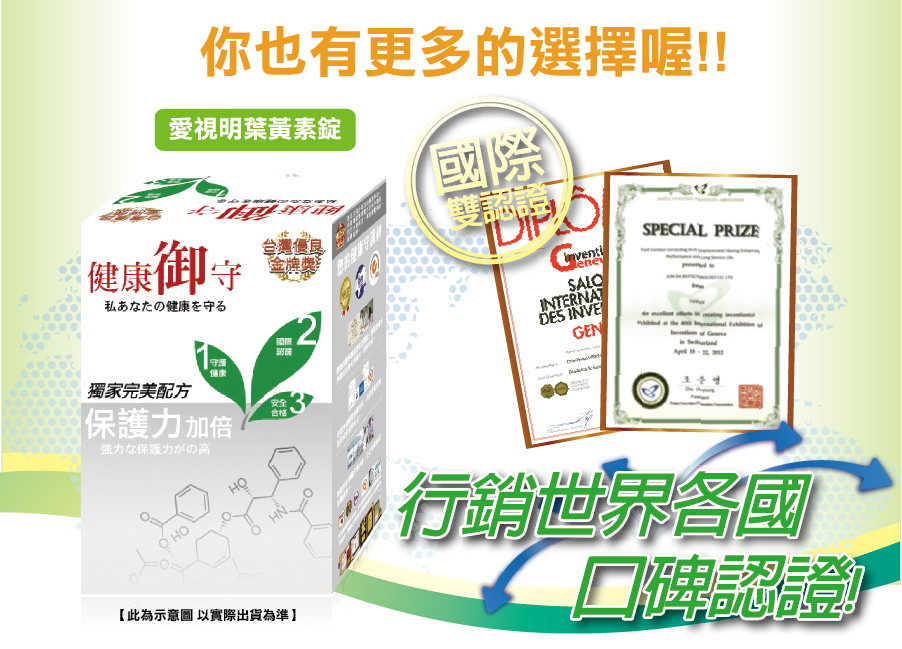 成 分:桑椹濃縮汁、小米草萃取、黑大豆穀萃取、枸杞子萃取、金盞草萃取(含葉黃素10%)、金盞草萃取(含玉米黃素5%)、B-胡蘿蔔素、維生素B2、維生素B12